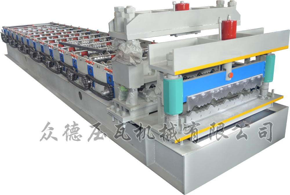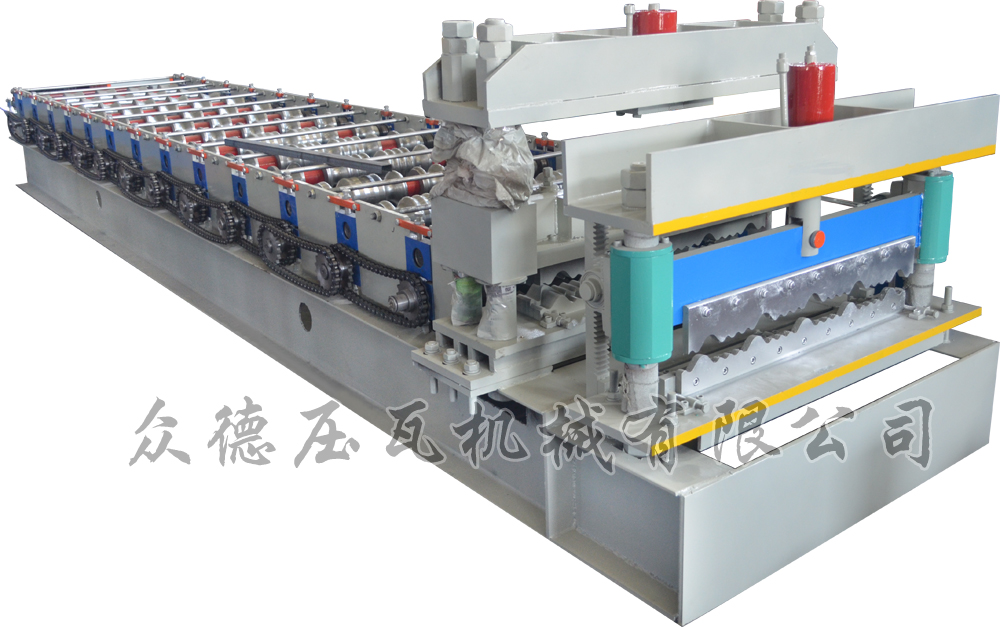 琉璃瓦压瓦机分为三部分,辊道成型部分、压型部分、切刀部分。辊道成型部分是由电机拖动,链条带动各辊转动。压型部分是液压缸带动模具上下移动,可以把彩钢压成许多节,形似琉璃瓦。切刀部分是液压缸带动刀具上下移动,可以把彩色钢瓦切断。