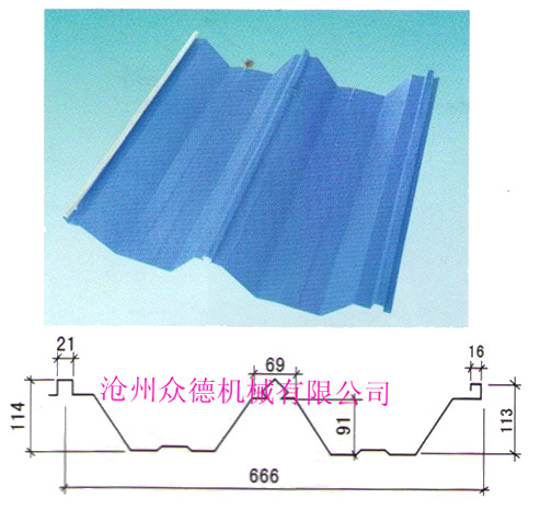 经角驰666型压瓦机辊轧成型的压型板属咬口屋面板,具有波峰高、强度大、无螺钉锁边咬口安装,搭接安装,抗台防暴等特点,而且生产自动化程度高,成本低廉,,重量轻,拼装组合自由方便。